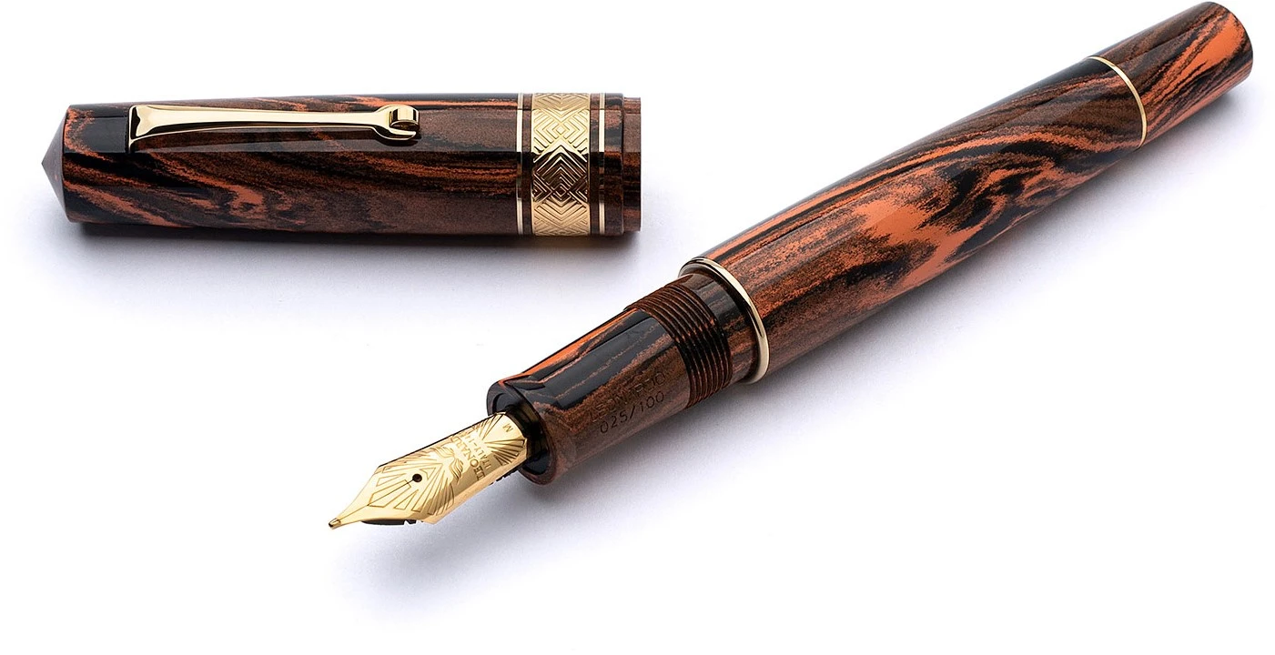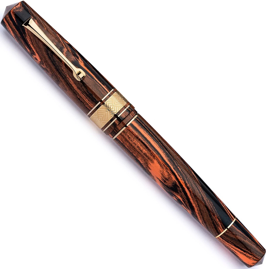 Leonardo Momento Zero Grande Masterpiece Flame vulpen, gemaakt van eboniet met de nieuwe 14k gouden La Fenice penpunt gemaakt in huis door Leonardo en een piston vulsysteem.