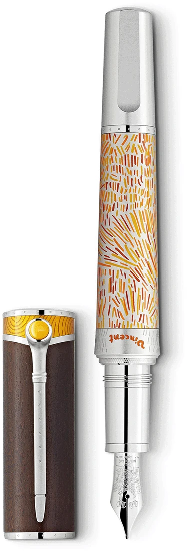Vincent van Gogh, geboren in 1853 in Nederland, is een van de meest populaire schilders van de late 19e eeuw en zijn visionaire ideeën worden nu gezien als voorlopers van het modernisme. Zijn pad van zelfontdekking begon in 1869 met zijn eerste baan als kunsthandelaar, maar pas in 1880 besloot hij kunstenaar te worden. Toen hij eenmaal toegewijd was, ging hij met passie aan de slag, schilderend en tekenend vanuit het landelijke leven om hem heen voordat hij in 1886 naar Parijs verhuisde, waar hij begon te experimenteren met kleuren en technieken geïnspireerd door het impressionisme, de leidende artistieke beweging van die tijd. Na twee jaar in Parijs vertrok hij naar Arles op zoek naar een nog intenser kleurenspectrum. Daar werd hij zeer productief en schilderde hij werken als “The Harvest”, een levendig landschap waar hij bijzonder blij mee was. Zijn kenmerkende stijl nu volledig gevormd, ging Van Gogh verder naar Saint-Rémy-de-Provence in 1889, waar hij nog meer meesterwerken creëerde, waaronder de Japans geïnspireerde “Amandelbloesem”. Van Gogh werkte duidelijk aan de voorhoede van de postimpressionistische kunst en blies zijn kunst nieuw leven in met zijn gedurfde kleurgebruik, dramatische penseelstreken en de impasto-techniek, waarbij hij verf dik op zijn doek aanbracht om diepte, emotie en beweging te creëren. Vincent van Gogh was ongelooflijk productief gezien de korte tijd dat hij actief was als schilder. In slechts een decennium maakte hij meer dan 800 schilderijen en meer dan 1100 tekeningen en schetsen. Met de Montblanc Masters of Art Homage to Vincent van Gogh Limited Edition 4810 viert Montblanc Vincent van Gogh en benadrukt vooral zijn tijd in Arles met ontwerpdetails die de Provençaalse korenvelden en een van zijn beroemdste schilderijen, “Zonnebloemen” weerspiegelen.